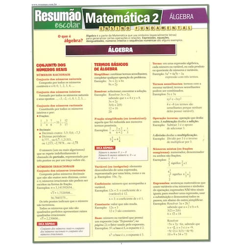 Este Resumão traz os principais pontos da álgebra: conjunto dos números reais, expressões, equações de primeiro grau, expoentes, funções, polinômios, operações com radicais, plano cartesiano, frações algébricas e equações de segundo grau. Na última página, resolução de sistemas de equações lineares.
