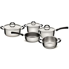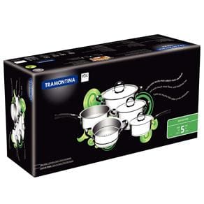 O conjunto de panelas Duo Silicone, da Tramontina, é composto por cinco peças feitas em aço inox altamente durável.