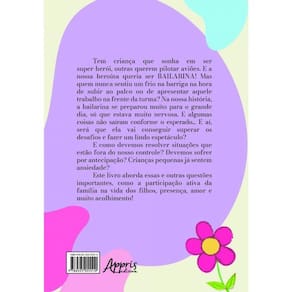 Tem criança que sonha em ser super-herói, outras querem pilotar aviões. E a nossa heroína queria ser BAILARINA! Mas quem nunca sentiu um frio na barriga na hora de subir ao palco ou de apresentar aquele trabalho na frente da turma? Na nossa história, a bailarina se preparou muito para o grande dia, só que estava muito nervosa. E algumas coisas não saíram conforme o esperado... E aí, será que ela vai conseguir superar os desafios e fazer um lindo espetáculo? E como devemos resolver situações que estão fora do nosso controle? Devemos sofrer por antecipação? Crianças pequenas já sentem ansiedade? Este livro aborda essas e outras questões importantes, como a participação ativa da família na vida dos filhos, presença, amor e muito acolhimento! Marca: ARTERINHA EDITORA