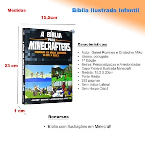 BIBLIA PARA MINECRAFTERS, O INCRÍVEL MUNDO DA BÍBLIA TRAZIDO ATÉ VOCÊ POR DOIS MESTRES CONSTRUTORES DO MINECRAFT. Entre em um mundo cheio de perguntas interessantes, perigosas e milagres. Vá até o Jardim do Éden e veja cachoeiras abundantes e paisagens exuberantes, acompanhe Noé na construção da sua arca; veja a divisão do Mar Vermelho, assista aos blocos dos muros de Jericó serem quebrados, testemunhe Jesus realizando os milagres, todos criados em Minecraft! Nessa edição brasileira, as histórias da Bíblia são recontadas em formas de blocos, capturando as aventuras tão conhecidas de tirar o fôlego.
