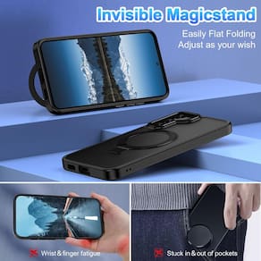 Capa?Suporte magnético invisível?Feito de alumínio de nível aeroespacial, o suporte é prático e multifuncional. Pode ser ajustada entre 40° e 120° para uma experiência de visualização estável e sem usar as mãos, e funciona como um suporte de anel para maior conveniência. Com estilo de vida N+1, pode ser utilizado para assistir TV, trabalhar em reuniões ou conversar por vídeo. - ?Modelos compatíveis? Esta capa fosca translúcida é compatível apenas com Samsung Galaxy S22, não compatível com nenhum outro modelo de telefone. - ?Compatível com acessórios MagSafe e carregamento sem fio?Esta capa de telefone com um anel magnético integrado que se alinha perfeitamente com os carregadores MagSafe e outros carregadores com certificação Qi, oferece uma forte experiência de fixação e carregamento sem fio mais rápido. Compatível com todos os acessórios Magsafe, como um carregador magnético, suporte magnético para carro, carteira magnética, carregador magnético, etc. Carregue do seu jeito. - ?Design fosco translúcido?Parte traseira fosca translúcida avançada, restaurando a textura metálica e exibindo o logotipo do seu telefone fracamente, evita que a capa fique suja ou amarele, com uma sensação refrescante e suave. A textura fosca oferece uma melhor aderência. - ?Material premium?Feito de moldura de TPU flexível e parte traseira de policarbonato antiarranhões protege seu telefone contra choques e arranhões sem adicionar volume. - ?Suporte magnético invisível?Feito de alumínio de nível aeroespacial, o suporte é prático e multifuncional. Pode ser ajustada entre 40° e 120° para uma experiência de visualização estável e sem usar as mãos, e funciona como um suporte de anel para maior conveniência. Com estilo de vida N+1, pode ser utilizado para assistir TV, trabalhar em reuniões ou conversar por vídeo.