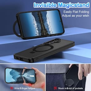 Capa?Suporte magnético invisível?Feito de alumínio de nível aeroespacial, o suporte é prático e multifuncional. Pode ser ajustada entre 40° e 120° para uma experiência de visualização estável e sem usar as mãos, e funciona como um suporte de anel para maior conveniência. Com estilo de vida N+1, pode ser utilizado para assistir TV, trabalhar em reuniões ou conversar por vídeo. - ?Modelos compatíveis? Esta capa fosca translúcida é compatível apenas com Samsung Galaxy S24 Plus, não é compatível com nenhum outro modelo de telefone. - ?Compatível com acessórios MagSafe e carregamento sem fio?Esta capa de telefone com um anel magnético integrado que se alinha perfeitamente com os carregadores MagSafe e outros carregadores com certificação Qi, oferece uma forte experiência de fixação e carregamento sem fio mais rápido. Compatível com todos os acessórios Magsafe, como um carregador magnético, suporte magnético para carro, carteira magnética, carregador magnético, etc. Carregue do seu jeito. - ?Design fosco translúcido?Parte traseira fosca translúcida avançada, restaurando a textura metálica e exibindo o logotipo do seu telefone fracamente, evita que a capa fique suja ou amarele, com uma sensação refrescante e suave. A textura fosca oferece uma melhor aderência. - ?Material premium?Feito de moldura de TPU flexível e parte traseira de policarbonato antiarranhões protege seu telefone contra choques e arranhões sem adicionar volume. - ?Suporte magnético invisível?Feito de alumínio de nível aeroespacial, o suporte é prático e multifuncional. Pode ser ajustada entre 40° e 120° para uma experiência de visualização estável e sem usar as mãos, e funciona como um suporte de anel para maior conveniência. Com estilo de vida N+1, pode ser utilizado para assistir TV, trabalhar em reuniões ou conversar por vídeo.