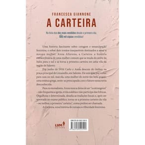 A Carteira Na lista dos dez mais vendidos desde o primeiro dia. 500.000 cópias vendidas! Uma história fascinante sobre coragem e emancipação feminina, e sobre dois irmãos inseparáveis destinados a amar a mesma mulher. Anna Allavena, a carteira: a história extraordinária de uma mulher aparentemente comum que se muda do norte da Itália para o sul e se torna a primeira carteira em uma pequena cidade na região de Salento. Em junho de 1934, Carlo e Anna descem do ônibus na praça principal de Lizzanello, em Salento. Ele está feliz por voltar para casa, no sul, mas ela, uma mulher do norte, tão bela quanto uma estátua grega, sente-se preocupada com o futuro nessa terra desconhecida. Para os moradores, Anna nunca deixa de ser "a forasteira" – não frequenta a igreja, evita a pequena cidade e não participa das fofocas. Orgulhosa e determinada, desafia as tradições locais e, após ser aprovada em um concurso público, torna-se a primeira carteira do local – ou melhor, a primeira "carteira", como prefere ser chamada. A Carteira, uma história de romance e liberdade feminina.