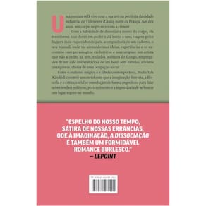 Uma menina órfã vive com a sua avó na periferia da cidade industrial de Villeneuve d’Ascq, norte da França. Aos dez anos, seu corpo negro se recusa a crescer. Com a habilidade de dissociar sua mente do corpo, ela transforma suas dores em poder e dá início a uma viagem pelo cantos mais esquecidos do país, acompanhada de um caderno, o seu Manual , onde vai anotando suas ideias, experiências e os encontros com personagens excêntricos e suas utopias: um artista que não acredita na arte, exilados políticos do Congo, empregados de um café universitário e de um hotel sem estrelas, ativistas anarquistas, chefes de uma ocupação social. Entre o realismo mágico e a fábula contemporânea, Nadia Yala Kisukifi constrói um enredo em que a imaginação literária, a filosofia e a crítica social se entrelaçam de forma engenhosa para falar sobre sonhos políticos, pertencimento e a importância de se buscar um lugar seguro no mundo. “Espelho do nosso tempo, sátira de nossas errâncias, ode à imaginação, A dissociação é também um formidável romance picaresco”. LePoint Este livro, publicado no âmbito do Programa de Apoio à Publicação da Embaixada da França no Brasil, contou com o apoio do Ministério francês da Europa e das Relações Exteriores.