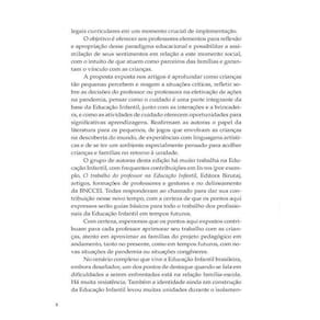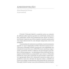 Com organização de Zilma Ramos de Oliveira (também organizadora do livro O trabalho do professor na Educação Infantil), cada capítulo do livro foi escrito por uma especialista da área. O objetivo desta obra é oferecer aos professores elementos para reflexão e apropriação desse paradigma educacional, possibilitando a assimilação de seus sentimentos e propondo novas reflexões. Os textos são uma proposta de investigação de como crianças tão pequenas perceberam e reagiram a situações críticas, bem como professores puderam efetivar suas ações na pandemia, dialogando com o cuidado, que é parte integrante da base da Educação Infantil, junto com as interações e as brincadeiras. O livro é composto por capítulos, escritos por diferentes educadoras: Cap. 1 – Quando o retorno é um novo começo, Zilma Ramos de Oliveira Cap. 2 – E as crianças brincam! Maria Teresa Vencesclau de Carvalho Cap. 3 – Escola, família e crianças: continuidade e regularidade, Ieda Abbud Cap. 4 – Cuidados na vida e na escola, Damaris Maranhão Cap. 5 – A interação dos bebês e das crianças com a literatura, Andréa Luize Cap. 6 – Tempo de planejar (re)encontros, Marisa Vasconcelos Ferreira e Thais Monteiro Ciardella Cap. 7 – Reflexões sobre a volta à escola em tempos de isolamento, Maria Paula Zurawski Cap. 8 – Mediar a investigação infantil no isolamento social, Ana Lucia Bresciane e Priscila Monteiro Ean: 9786556510675