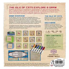 Explore & Draw é um jogo de tabuleiro competitivo de colocação de gatos poliomino para 1-6 jogadores que é ideal para uma pausa rápida ou para a casa de um amigo. Cada rodada os jogadores escolhem um grupo de cartas e, em seguida, as desenham em seu barco enquanto tentam completar objetivos diferentes. Visão geral do jogo: No jogo, você é cidadão de Squalls End em uma missão de resgate para a Ilha dos Gatos e deve resgatar o maior número possível de gatos antes que o malvado Lord Vesh chegue. Cada gato é representado por uma forma única e pertence a uma família, você deve encontrar uma maneira de torná-los todos aptos em seu barco, mantendo as famílias unidas. Complete as lições, encha seu barco e mantenha as famílias de gatos juntas para marcar pontos, e o jogador com mais pontos após sete rodadas vence. The Isle of Cats: Explore & Draw é um novo jogo baseado no premiado jogo de tabuleiro The Isle of Cats. Inclui o Modo Solo também! Explore & Draw apresenta um modo solo personalizado onde você precisará superar sua irmã que está tentando reivindicar crédito por todo o seu trabalho duro.
