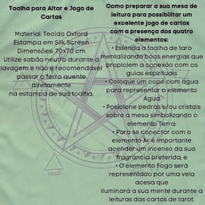 A Legítima Toalha Pentagrama Jogo de Cartas 70x70 cm Verde A Verdadeira e Tradicional Toalha de Mesa Pentagrama para jogos de cartas e Altar Esta é a Legítima Toalha de Mesa jogos de cartas, deixando sua mesa bonita, moderna e sofisticada e intuitiva. Desenvolvida pensando em deixar o seu jogo de cartas mais confortável e prático. É composta por tecido, linda estampa, o que oferece ainda mais requinte ao teu jogo. Boa Qualidade de impressão, podendo ser utilizada em altares, desenvolvida especialmente para jogos de cartas intuitivas. Características: - Composição: Tecido Oxford - Impressão: Silk Screen - Cor bem definida - - Tamanho: Quadrada 70 cm x 70 cm - Acabamento : Overlock - Extremamente leve, suave e confortável - Lavável em máquina Lava e Seca Imagens meramente ilustrativas