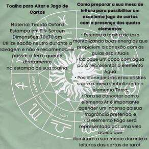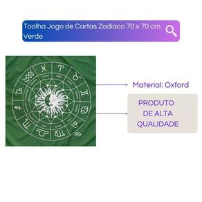 A Legítima Toalha Zodiaco P Jogos Cartas 70x70cm Verde A Verdadeira e Tradicional Toalha Zodíaca desenvolvida para jogos de cartas e Altar.Esta é a Legítima Toalha de Mesa Para jogos de cartas, deixando sua mesa bonita, moderna e sofisticada e intuitiva. Desenvolvida pensando em deixar o seu jogo de cartas mais confortável e prático.É composta por tecido, linda estampa, o que oferece ainda mais requinte ao teu jogo. Boa Qualidade de impressão, podendo ser utilizada em altares, desenvolvida especialmente para jogos de cartas intuitivas.- Composição: Tecido Oxford- Impressão: Silk Screen- Acabamento : Overlock - Cor bem definida - Quadrada 70 cm x 70 cm- Extremamente leve, suave e confortável- Lavável em máquina Lava e SecaÉ composta por tecido, linda estampa, o que oferece ainda mais requinte ao teu jogo. Boa Qualidade de impressão, podendo ser utilizada em altares, desenvolvida especialmente para jogos de cartas intuitivas. Embalagem de Envio: Envelope plástico, conforme necessidade do produto. Respostas das dúvidas mais frequentes na ordem:R1: Já realizamos milhares de entregas em todo o Brasil, somos especialistas no que fazemos.R2: Assim que seu pedido for despachado, esta plataforma envia para você o código de rastreamento.R3: Enviamos o produto 100% inspecionado e conferido em nosso checkout e são embalados em embalagem de papelão e plástico bolha.R5: Iremos despachar o seu produto o mais rápido possível, assim que for confirmado pela plataforma, enviamos em até 24h.R6: Nós queremos a sua satisfação, qualquer problema iremos te auxiliar em nossos canais de comunicações. Marca: Meta Atacado