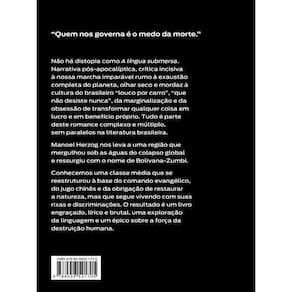 Após um cataclisma ambiental, só uma região na América Latina sobreviveu ao avanço das águas: Bolivana-Zumbi. Sua classe média remanescente se reestruturou à base do comando evangélico, do jugo chinês e da obrigação de restaurar a natureza, mas segue com suas rixas e discriminações. O resultado é um livro épico, sobre a força da destruição humana. “Quem nos governa é o medo da morte.” Este é um romance complexo e múltiplo, sem paralelos na literatura brasileira. Após uma catástrofe ambiental, a América Latina, ou o que sobrou dela, é agora a nação Bolivana-Zumbi, o “gigante dócil e inofensivo” onde a moeda se chama bênção e o poder dominante, fantoche dos desígnios chineses, é a Eclésia, gerida pela igreja evangélica Bola de Fogo. Aqui a natureza é a principal preocupação: é expressamente proibido desmatar e caçar animais silvestres, e os infratores pagam com a morte. Em Bolivana-Zumbi se fala o portunhol, pois o português se tornou a língua submersa — e proibida. Manoel Herzog nos leva, com contundência e um humor desconcertante, às entranhas dessa nova sociedade que habita as antigas regiões de Santos e Cubatão. Em pequenas sagas que se sobrepõem e se complementam, conhecemos um mundo novo e perturbador, onde a própria realidade é tecida de pesadelos.