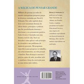"A força realizadora do pensamento construtivo. Milhares de pessoas ao redor do mundo conseguiram prosperar graças às técnicas ensinadas por David J. Schwartz. Em cada capítulo de A mágica de pensar grande você encontrará dezenas de ideias firmes, princípios e práticas que lhe possibilitarão dominar e direcionar o seu pensamento positivo. Cada técnica é ilustrada com uma história real de vida. Você vai descobrir como aplicar cada princípio às situações e aos problemas do momento presente. Há programas específicos para prosperar no trabalho, nos relacionamentos, na vida pessoal e familiar. Para alcançar o sucesso é preciso, antes de tudo, acreditar nele e canalizar a força da convicção para as suas metas mais nobres. "