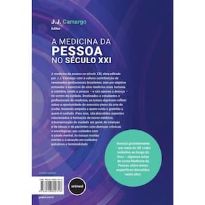 . O livro A medicina da pessoa no século XXI , editada por J.J. Camargo com a valiosa contribuição de renomados profissionais brasileiros, tem por objetivo estimular o exercício de uma medicina mais humana e solidária, tendo a pessoa – e não apenas a doença – no centro do cuidado. Destinados e estudantes e profissionais de medicina, os textos objetivam refletir sobre a oportunidade do exercício pleno da arte de cuidar, trazendo empatia a quem cuida e gratidão a quem é cuidado. Para isso, são discutidos aspectos relacionados à formação de novos médicos; à humanização do cuidado em geral, de crianças e de idosos, em casos de doenças crônicas e oncológicas; à saúde mental, às nossas muitas mortes e à atuação em cuidados paliativos e terminalidade.