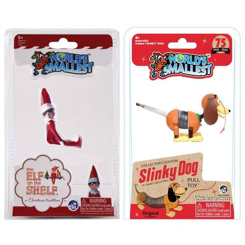 Reviva suas memórias de infância com o Slinky Dog Slinky Dog, edição de colecionador mais pequeno do mundo! Seus filhos podem reconhecê-lo nos populares filmes “Toy Story”, mas o Slinky Dog é um brinquedo clássico que diverte crianças desde 1945! Animado com a famosa primavera Slinky, este cão de brinquedo inesquecível entra em ação quando puxado pela coleira. Medindo apenas 3 x 1,75 x 1 polegada, o menor cão furtivo do mundo abana o rabo, mexe o corpo, bate as orelhas e se estica como um acordeão. Este brinquedo de puxar atemporal é o melhor amigo de qualquer geração! O menor elfo do mundo na prateleira é um clássico natalino atemporal! Uma réplica em miniatura do elfo em tamanho real na prateleira, World's Smallest tem menos de 4 polegadas da ponta do chapéu até a parte inferior dos pés e é totalmente articulado. É o brinquedo e meias colecionáveis de Natal perfeito!