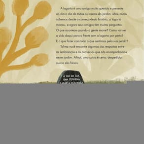 Com delicadeza, acolhimento e leveza, este é um livro que fala sobre um assunto para o qual dificilmente estamos preparados: a morte de alguém querido. A lagarta é uma amiga muito querida e presente no dia a dia de todos os insetos do jardim. Mas, como sabemos desde o começo desta história, a lagarta morreu, e agora seus amigos têm muitas perguntas. O que acontece quando a gente morre? Como vai ser a vida daqui para a frente, sem a lagarta por perto? E o que fazer com tudo o que eles sentem depois de sua perda? Os leitores podem encontrar algumas dessas respostas entre as lembranças e as conversas que os acompanham neste jardim. Com uma linguagem objetiva repleta de carisma e empatia, os autores deste livro propõem uma reflexão sobre o que é a morte — e como ela se relaciona com a vida, com a natureza e com os nossos sentimentos. Afinal, uma coisa é certa: despedidas não são fáceis, mas o acolhimento e o respeito às emoções fazem toda a diferença. Indicado para leitores a partir de 6 anos.