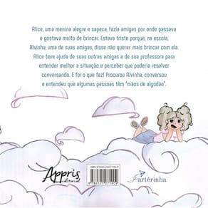 Alice, uma menina alegre e sapeca, fazia amigas por onde passava e gostava muito de brincar. Estava triste porque, na escola, Alvinha, uma de suas amigas, disse não querer mais brincar com ela. Alice teve ajuda de suas outras amigas e de sua professora para entender melhor a situação e perceber que poderia resolver conversando. E foi o que fez! Procurou Alvinha, conversou e entendeu que algumas pessoas têm “mãos de algodão”.