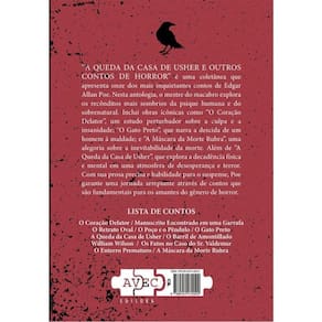 A QUEDA DA CASA DE USHER E OUTROS CONTOS DE HORROR" é uma coletânea que apresenta onze dos mais inquietantes contos de Edgar Allan Poe. Nesta antologia, o mestre do macabro explora os recônditos mais sombrios da psique humana e do sobrenatural. Inclui obras icônicas como "O Coração Delator", um estudo perturbador sobre a culpa e a insanidade; "O Gato Preto", que narra a descida de um homem à maldade; e "A Máscara da Morte Rubra", uma alegoria sobre a inevitabilidade da morte. Além de "A Queda da Casa de Usher", que explora a decadência física e mental em uma atmosfera de desesperança e terror. Com sua prosa precisa e habilidade para o suspense, Poe garante uma jornada arrepiante através de contos que são fundamentais para os amantes do gênero de horror. LISTA DE CONTOS: O Coração Delator / Manuscrito Encontrado em uma Garrafa / O Retrato Oval / O Poço e o Pêndulo / O Gato Preto /A Queda da Casa de Usher / O Barril de Amontillado / William Wilson / Os Fatos no Caso do Sr. Valdemar / O Enterro Prematuro / A Máscara da Morte Rubra