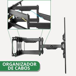 Atributos e benefícios: - Funções: Avanço / Recuo da tela; - Giro horizontal: Até 60º (Esquerda / Direita - Limitado ao tamanho da tela da TV); - Ajuste de inclinação: Até 5º para cima e 15º para baixo; - Inclinação lateral (Correção de Nível): +/- 3º. - Movimentos leves e precisos para melhor posicionamento da TV; - Acompanha exclusivo nível bolha magnético; - Parafuso extralongo M8x50 para TVs Samsung - Organizador de cabos; - Trava de segurança.