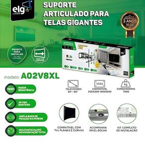 Especificações técnicas: - Marca: ELG - Fabricante: ELG - Modelo: A02V8XL - Nome do modelo: A02V8XL - Certificação: Não aplicável - Número da peça: A02V8XL - Tipo Do Produto: Eletrônicos - Aparelhos compatíveis: TVs entre 55" a 90" que apresentem peso máximo de 75kg - Funciona com baterias: Não - Tipo de material: Aço carbono - Tipo de suporte ou fixação: Montagem na parede - Cor: PRETO