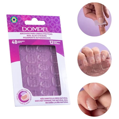 Os Adesivos para unhas Postiças Dompel são perfeitos para usar em casa e para as pessoas que não querem ou não podem utilizar cola. Com 48 unidades de diferentes tamanhos colam em ambos os lados (dupla face), são práticos de destacar, aplicar e fixam as unhas postiças por até 7 dias. Não danificam a unha natural.