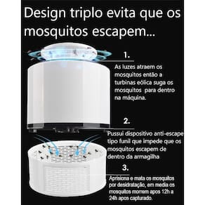 cobertura da armadilha de mosquitos de 360°: ele possui 4 leds uv que ilumina em 360 graus, atraindo os mosquitos de todos os cantos do ambiente que estiver escuro.