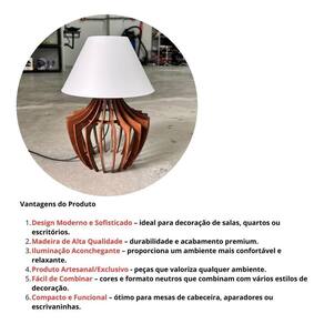 ATENÇÃO NÃO ACOMPANHA LAMPADA Características do Produto: Material: Madeira de alta qualidade Design: Moderno e minimalista Iluminação: Suave e aconchegante Ideal para: Mesas de cabeceira, aparadores, estantes ou escrivaninhas Compatível com lâmpadas LED ou comuns soquete padrão E27 Tamanho Altura: 32cm Diâmetro: 22cm Vantagens para você: Produto com acabamento premium Peça versátil que combina com vários estilos de troca em caso de defeito de fabricação Marca: Não Informado Ean: 7897209147086