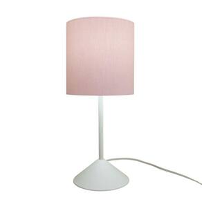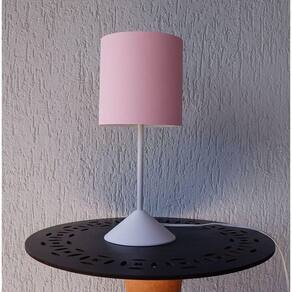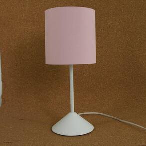 Abajur de mesa com base plástica na cor branca. Cúpula em tecido liso rosa claro.