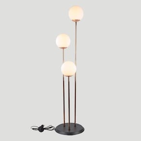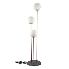 Abajur Coluna Newton 3 Globos Esfera De Vidro Branco - Cobre O abajur coluna Newton lembra as clássicas luminárias, ideal ser colocadas em quartos, salas de jantar ou estar. Com tubo de alumínio e esfera de vidro este modelo se adapta a sua decoração. Possui chave liga e desliga no cabo próximo a sua base no estilo botão de piso. A lâmpada se encaixa no soquete padrão E27. Descrição Técnica: - Modelo: Abajur Coluna Newton - Acabamento da Base e Tubo: Pintura a pó eletrostática - Material: Alumínio e Vidro - Quant. soquetes: 3 - Tamanho: Base 29 cm de diâmetro - Altura total 1 m - Soquete: Padrão E27 - Interruptor piso: Sim - Bivolt: Sim - Flecha (Tomada): Padrão Brasil **. Envio semi montado**