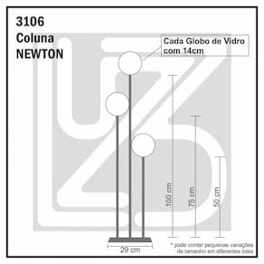 Abajur Coluna Newton 3 Globos Esfera De Vidro Branco - Preto O abajur coluna Newton lembra as clássicas luminárias, ideal ser colocadas em quartos, salas de jantar ou estar. Com tubo de alumínio e esfera de vidro este modelo se adapta a sua decoração. Possui chave liga e desliga no cabo próximo a sua base no estilo botão de piso. A lâmpada se encaixa no soquete padrão E27. Descrição Técnica: - Modelo: Abajur Coluna Newton - Acabamento da Base e Tubo: Pintura a pó eletrostática - Material: Alumínio e Vidro - Quant. soquetes: 3 - Tamanho: Base 29 cm de diâmetro - Altura total 1 m - Soquete: Padrão E27 - Interruptor piso: Sim - Bivolt: Sim - Flecha (Tomada): Padrão Brasil **. Envio semi montado**