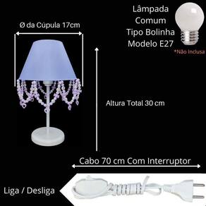 - cúpula de polipropileno plástico resistente na cor lilás; - base em acrílico branco; - haste de acrílico branco; - pingentes de coração lilás, pedrinhas roxas, emojis; - altura total do abajur 30 cm; - diâmetro maior da cúpula mede 17 cm; - soquete para lâmpadas modelo e-27 bivolt aceita lâmpadas 110v e 220v ; - usar lâmpada de no máximo 40w lâmpada não incluso ; - importante: imagens reais do produto, porém as cores dos pingentes e pérolas podem variar de acordo com cada produto fabricado, conforme disponibilidade Do estoque