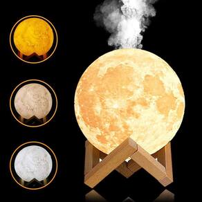 Lua umidificador de ar e luminária em 3 tonalidades com suporte de madeira. Lua feita com tecnologia de impressão 3d, realista em forma da lua cheia. Abajur com 3 tonalidades de coloração, sendo escolhidas conforme o toque no controle. Adequado para salas de pequeno e médio porte.