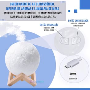 Lua em 3d com luminária e com tecnologia difusor Controles da iluminação e umidificação por pinos metálicos dispostos na tampa Suporte de madeira Fio usb para corrente de energia Filtro dentro do aparelho Manual de instruções