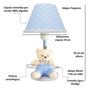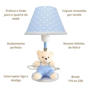 Transforme o quartinho do seu bebê em um verdadeiro reino de ternura com este lindo abajur Urso Príncipe Com um design delicado e encantador, ele combina perfeitamente com decorações nos temas Ursinho, Realeza ou Príncipe, criando um ambiente aconchegante e acolhedor. Ideal para mesas de apoio, cômodas, dentre outros, o abajur proporciona uma iluminação suave, perfeita para momentos de amamentação, troca de fraldas ou para deixar o bebê mais tranquilo durante a noite. Destaques do Produto: Modelo: Urso Príncipe com coroa dourada Iluminação suave, ideal para o quarto do bebê Base estável e estrutura resistente Acabamento delicado e artesanal Combina com diversos temas infantis Ótima opção de presente para chá de bebê, nascimento ou batizado Especificações Técnicas: Voltagem: 110V/220V ou bivolt Tipo de lâmpada: ex: LED ou incandescente - não inclusa Material: MDF, tecido Lindo abajur infantil em tecido com um ursinho na base para o quarto do bebê ou criança, ideal para deixar o ambiente com funcionalidade e muito mais charme e beleza. O abajur é ideal para proporcionar uma luz suave e reconfortante durante a noite, ajudando as crianças a se sentirem mais seguras e tranquilas enquanto dormem. O abajur infantil vai deixar o quarto pronto para a chegada do bebê em casa O abajur infantil e para bebês é uma ótima opção para adicionar um toque aconchegante e alegre ao quarto dos pequenos. Onde usar: Poderá ser colocado na cômoda ou mesa Contém:1 Abajur - com iluminação suave, ajuda as mamães a cuidar do bebê à noite. Composição: Abajur com cúpula de polipropileno plástico , revestido por tecido 100% algodão. Base de madeira revestida de tecido Metragem: Abajur 30cm altura Cúpula 10cm x 18cm Bivolt: 110V ou 220V Lâmpada: usar de no máximo 40W não inclusa lâmpada de bolinha Tamanho fio 90 cm com liga / desliga Conteúdo da embalagem: 1 abajur com urso na base Limpeza: Basta limpar com espanador ou pano seco. Marca: Não Informado