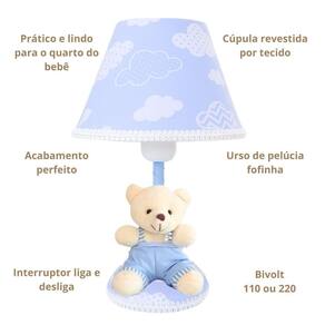 Transforme o quartinho do seu bebê em um verdadeiro reino de ternura com este lindo Abajur Nuvem Com um design delicado e encantador, ele combina perfeitamente com decorações nos temas Ursinho ou Nuvens, criando um ambiente aconchegante e acolhedor. Ideal para mesas de apoio, cômodas, dentre outros, o abajur proporciona uma iluminação suave, perfeita para momentos de amamentação, troca de fraldas ou para deixar o bebê mais tranquilo durante a noite. Destaques do Produto: Modelo: Nuvem Iluminação suave, ideal para o quarto do bebê Base estável e estrutura resistente Acabamento delicado e artesanal Combina com diversos temas infantis Ótima opção de presente para chá de bebê, nascimento ou batizado Especificações Técnicas: Voltagem: 110V/220V ou bivolt Tipo de lâmpada: ex: LED ou incandescente - não inclusa Material: MDF, tecido Lindo abajur infantil em tecido com um ursinho na base para o quarto do bebê ou criança, ideal para deixar o ambiente com funcionalidade e muito mais charme e beleza. O abajur é ideal para proporcionar uma luz suave e reconfortante durante a noite, ajudando as crianças a se sentirem mais seguras e tranquilas enquanto dormem. O abajur infantil vai deixar o quarto pronto para a chegada do bebê em casa O abajur infantil e para bebês é uma ótima opção para adicionar um toque aconchegante e alegre ao quarto dos pequenos. Onde usar: Poderá ser colocado na cômoda ou mesa Contém:1 Abajur - com iluminação suave, ajuda as mamães a cuidar do bebê à noite. Composição: Abajur com cúpula de polipropileno plástico , revestido por tecido 100% algodão. Base de madeira revestida de tecido Metragem: Abajur 30cm altura Cúpula 10cm x 18cm Bivolt: 110V ou 220V Lâmpada: usar de no máximo 40W não inclusa lâmpada de bolinha Tamanho fio 90 cm com liga / desliga Conteúdo da embalagem: 1 abajur com urso na base Limpeza: Basta limpar com espanador ou pano seco. Marca: Não Informado