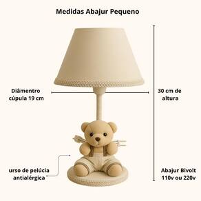 Transforme o quartinho do seu bebê em um verdadeiro reino de ternura com este lindo abajur Urso na cor Bege. Com um design delicado e encantador, ele combina perfeitamente com decorações nos temas Ursinho, Balão ou Nuvens, criando um ambiente aconchegante e acolhedor. Ideal para mesas de apoio e cômodas, o abajur proporciona uma iluminação suave, perfeita para momentos de amamentação, troca de fraldas ou para deixar o bebê mais tranquilo durante a noite. Destaques do Produto: Modelo: Urso Iluminação suave, ideal para o quarto do bebê Base estável e estrutura resistente Acabamento delicado e artesanal Combina com diversos temas infantis Ótima opção de presente para chá de bebê, nascimento ou batizado Especificações Técnicas: Voltagem: 110V/220V ou bivolt Tipo de lâmpada: ex: LED ou incandescente - não inclusa Material: MDF, tecido Lindo abajur infantil em tecido com um ursinho na base para o quarto do bebê ou criança, ideal para deixar o ambiente com funcionalidade e muito mais charme e beleza. O abajur é ideal para proporcionar uma luz suave e reconfortante durante a noite, ajudando as crianças a se sentirem mais seguras e tranquilas enquanto dormem. O abajur infantil vai deixar o quarto pronto para a chegada do bebê em casa O abajur infantil e para bebês é uma ótima opção para adicionar um toque aconchegante e alegre ao quarto dos pequenos. Onde usar: Poderá ser colocado na cômoda ou mesa Contém:1 Abajur - com iluminação suave, ajuda as mamães a cuidar do bebê à noite. Composição: Abajur com cúpula de polipropileno plástico , revestido por tecido 100% algodão. Base de madeira revestida de tecido Metragem: Abajur 30cm altura Cúpula 10cm x 18cm Bivolt: 110V ou 220V Lâmpada: usar de no máximo 40W não inclusa lâmpada de bolinha Tamanho fio 90 cm com liga / desliga Conteúdo da embalagem: 1 abajur com urso na base Limpeza: Basta limpar com espanador ou pano seco.