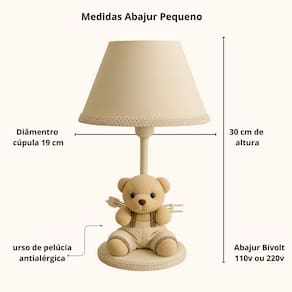 Transforme o quartinho do seu bebê em um verdadeiro reino de ternura com este lindo abajur Urso na cor Bege. Com um design delicado e encantador, ele combina perfeitamente com decorações nos temas Ursinho, Balão ou Nuvens, criando um ambiente aconchegante e acolhedor. Ideal para mesas de apoio e cômodas, o abajur proporciona uma iluminação suave, perfeita para momentos de amamentação, troca de fraldas ou para deixar o bebê mais tranquilo durante a noite. Destaques do Produto: Modelo: Urso Iluminação suave, ideal para o quarto do bebê Base estável e estrutura resistente Acabamento delicado e artesanal Combina com diversos temas infantis Ótima opção de presente para chá de bebê, nascimento ou batizado Especificações Técnicas: Voltagem: 110V/220V ou bivolt Tipo de lâmpada: ex: LED ou incandescente - não inclusa Material: MDF, tecido Lindo abajur infantil em tecido com um ursinho na base para o quarto do bebê ou criança, ideal para deixar o ambiente com funcionalidade e muito mais charme e beleza. O abajur é ideal para proporcionar uma luz suave e reconfortante durante a noite, ajudando as crianças a se sentirem mais seguras e tranquilas enquanto dormem. O abajur infantil vai deixar o quarto pronto para a chegada do bebê em casa O abajur infantil e para bebês é uma ótima opção para adicionar um toque aconchegante e alegre ao quarto dos pequenos. Onde usar: Poderá ser colocado na cômoda ou mesa Contém:1 Abajur - com iluminação suave, ajuda as mamães a cuidar do bebê à noite. Composição: Abajur com cúpula de polipropileno plástico , revestido por tecido 100% algodão. Base de madeira revestida de tecido Metragem: Abajur 30cm altura Cúpula 10cm x 18cm Bivolt: 110V ou 220V Lâmpada: usar de no máximo 40W não inclusa lâmpada de bolinha Tamanho fio 90 cm com liga / desliga Conteúdo da embalagem: 1 abajur com urso na base Limpeza: Basta limpar com espanador ou pano seco. Marca: Não Informado