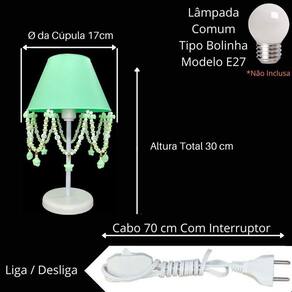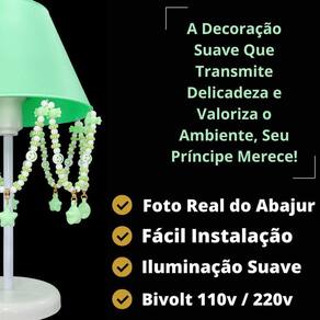 - cúpula de polipropileno plástico resistente na cor verde; - base em acrílico branco; - haste de acrílico branco; - pingentes de estrela, pérolas, caracol, balinhas verde, emojis; - altura total do abajur 30 cm; - diâmetro maior da cúpula mede 17 cm; - soquete para lâmpadas modelo e-27 bivolt aceita lâmpadas 110v e 220v ; - usar lâmpada de no máximo 40w lâmpada não incluso ; - importante: imagens reais do produto, porém as cores dos pingentes e pérolas podem variar de acordo com cada produto fabricado, conforme disponibilidade Do estoque
