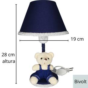 Especificações Técnicas: - Título: Abajur Infantil Bebê Quarto Criança Liso Urso Claro Marinho - Material: Cúpula de polipropileno revestida por tecido 100% algodão, base de madeira revestida de tecido - Altura: 28cm - Diâmetro da cúpula: 8cm parte superior / 19cm parte inferior - Voltagem: Bivolt 110V ou 220V - Lâmpada: Utiliza lâmpada de no máximo 40W não inclusa - Conteúdo da embalagem: 1 abajur com urso na base