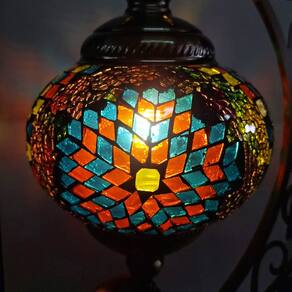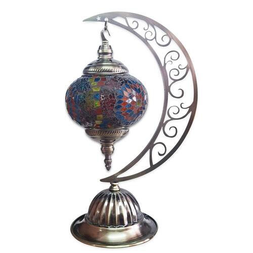 Lindo Abajur de mesa decorativo Turco, com suporte de metal bronzeado e cúpula circular artesanal em mosaico de vidros.