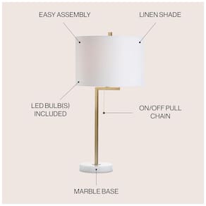Este candeeiro de mesa contemporâneo apresenta um design linear e moderno, com linhas limpas que trazem uma simplicidade sofisticada para qualquer ambiente. Equipado com uma corrente de puxar, ele ilumina a lâmpada LED única, que é econômica e durável. A base de disco em mármore e o cabo revestido em seda complementam o estilo elegante do candeeiro, estendendo a sofisticação até o plugue.