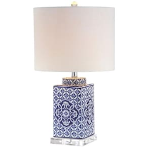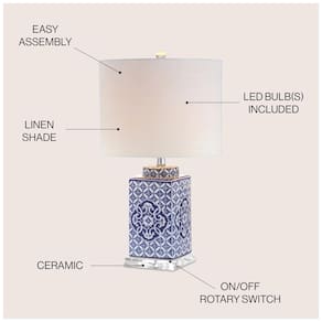 Este candeeiro de mesa azul e branco traz um toque moderno com sua base de acrílico transparente. O abajur em linho, com bordas arredondadas, complementa o design elegante, que é finalizado com um detalhe em Lucite e um cordão revestido em seda. As lâmpadas de mesa JONATHAN Y são projetadas para iluminar sua casa com sofisticação, sendo a escolha perfeita para qualquer ambiente.