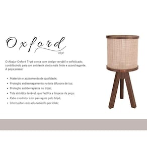 Abajur Muller Oxford Tripé Preto 1 Lâmpada 130pt ABAJUR MULLER OXFORD TRIPÉ PRETO 1 LÂMPADA 130PT Marca: Luminárias Mller Modelo: Oxford Tripé Preto 1 Lâmpada 130PT DESCRIÇÃO DO ABAJUR OXFORD TRIPÉ - O Abajur Oxford Tripé conta com design versátil e sofisticado, contribuindo para um ambiente ainda mais lindo e aconchegante; - Sua combinação com a madeira proporciona leveza e elegância ao ambiente; - Garante um estilo atemporal; - Materiais e acabamento de qualidade; - Produzido com madeira reflorestada maciça e laminada.