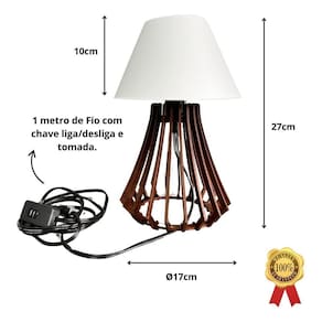 Ficha técnica: Cor das cúpula: preto Medidas com a cúpula: largura: 17cm / altura: 27cm Materiais: madeira mdf com dupla pelicula amadeirada Fio de 1 metro Alimentação: bivolt 110v / 220v Potência: 100 w Ambientes: quarto, sala Capacidade de lâmpadas: 1 Tipos de fontes de luz: soquete e27 Tipo de soquete: e27 Marca: Não Informado