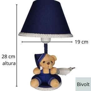 O Abajur Infantil Bebê Quarto Criança Marinho Soneca Urso Bege é perfeito para deixar o quarto do bebê ainda mais charmoso e funcional. Com um lindo ursinho na base, esse abajur em tecido é ideal para iluminar o ambiente de forma suave, proporcionando a luz certa para facilitar as mamadas e as trocas noturnas.
