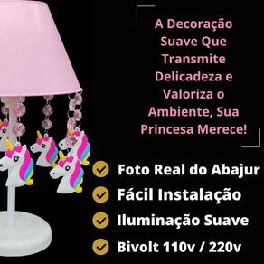 O abajur de quarto infantil unicórnio de mesa é o item perfeito para decorar o quarto das crianças com muito estilo e encanto. Feito de forma artesanal e com um design moderno, ele ilumina muito bem o ambiente, proporcionando uma atmosfera aconchegante e agradável. A cúpula do abajur é feita de polipropileno, um plástico resistente, na cor rosa bebê, o que confere um toque suave e delicado ao produto. A base e a haste são feitas de acrílico branco, garantindo estabilidade e durabilidade. Os pingentes de unicórnio, feitos de aplique emborrachado, adicionam um charme especial ao abajur. Com argolas de inox e castanhas de acrílico rosa bebê, o abajur possui um acabamento impecável e de alta qualidade. Sua altura total é de 30 cm e o diâmetro maior da cúpula mede 17 cm, o que faz dele um tamanho ideal para compor a decoração do quarto infantil. O abajur possui soquete para lâmpadas modelo e-27 bivolt, ou seja, ele aceita lâmpadas tanto de 110v quanto de 220v. É importante ressaltar que a lâmpada não está inclusa, sendo necessário adquirir uma lâmpada de no máximo 10w. Essa potência é ideal para proporcionar uma iluminação suave e aconchegante ao ambiente. Além de iluminar, o abajur de quarto infantil unicórnio de mesa também é uma peça decorativa encantadora. Com seu design temático de unicórnio, ele adiciona um toque lúdico e mágico ao quarto das crianças. É perfeito para meninas que adoram esse tema e desejam um ambiente cheio de encanto. Com esse abajur, a decoração do quarto infantil ficará completa e cheia de personalidade. Ele é ideal para criar um ambiente acolhedor e para as crianças, seja para momentos de leitura, brincadeiras ou descanso. Adquira agora mesmo o abajur de quarto infantil unicórnio de mesa e surpreenda as crianças com um item encantador e cheio de estilo. Garanta um ambiente iluminado e aconchegante para os pequenos, com um toque mágico de unicórnio.