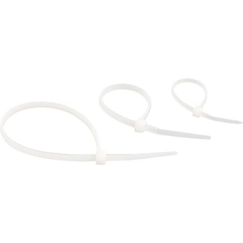 1 Tubo plástico com 300 abraçadeiras de nylon: 100 abraçadeiras 100 mm x 2,5 mm x 1,1 mm, 120 abraçadeiras 140 mm x 3,6 mm x 1,2 mm e 80 abraçadeiras 200 mm x 3,6 mm x 1,3 mm
