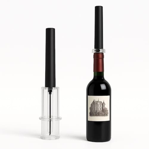 A agulha deve ser inserida verticalmente no centro da rolha. Com algumas bombeadas (de 3 a 7), o ar é injetado dentro da garrafa, fazendo a pressão interna expelir a rolha sem danificá-la. Para retirar a rolha do saca-rolhas, basta empurrar levemente.
