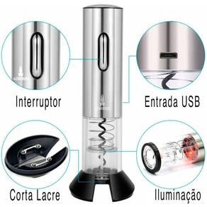 Abridor Vinho Saca Rolha Elétrico com Luz de Led sem Fio Bateria Recarregável Lorben