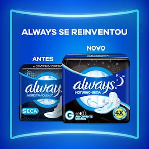 ABSORVENTE ALWAYS NOITES TRANQUILAS SECA COM ABAS Durma sem preocupações e descanse agradavelmente com os novos absorventes Always Noites Tranquilas com cobertura Seca, desenhado para dormir à noite t