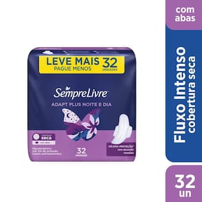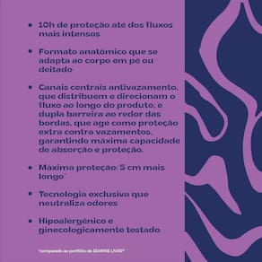 Benefícios e diferenciais - Centro elevado e canais antivazamento que garantem absorção instantânea até dos fluxos mais intensos; - Até 10h de proteção contra vazamentos; - Máxima* proteção: 5cm mais longo (*comparado com o portfólio de SEMPRE LIVRE); - Formato anatômico que se adapta ao corpo em pé ou deitado; - Tecnologia exclusiva que neutraliza odores; - Hipoalergênico e Ginecologicamente Testado; - Ultra suave: 70% de ingredientes de origem natural e livre de fragrância e corante - Cobertura Suave.