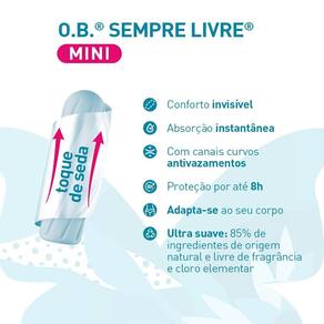 O Absorvente interno OB possui uma ponta cônica, é pequno e estreito para ser confortável de usar desde o primeiro dia. Cobertura exclusiva Silktouch que desliza facilmente, o que permite fácil colocação e remoção. Tecnologia com exclusivas curvas entrelaçadas para otimizar a absorção e reduzir vazamentos. Recomenda-se a troca a cada 4 a 8 horas.