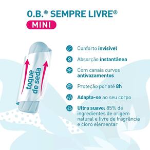 O.B. SEMPRE LIVRE é um absorvente interno desenvolvido por uma ginecologista para proporcionar proteção e conforto para a mulher durante o período menstrual. O núcleo absorvente de O.B. SEMPRE LIVRE é